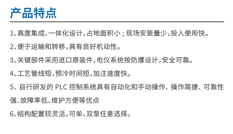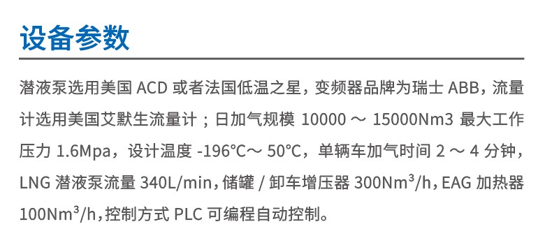 具備LNG卸車功能(差壓卸車、泵卸車)、LNG儲(chǔ)罐調(diào)飽和功能、LNG儲(chǔ)罐增壓功能、LNG加氣功能及待機(jī)預(yù)冷功能。